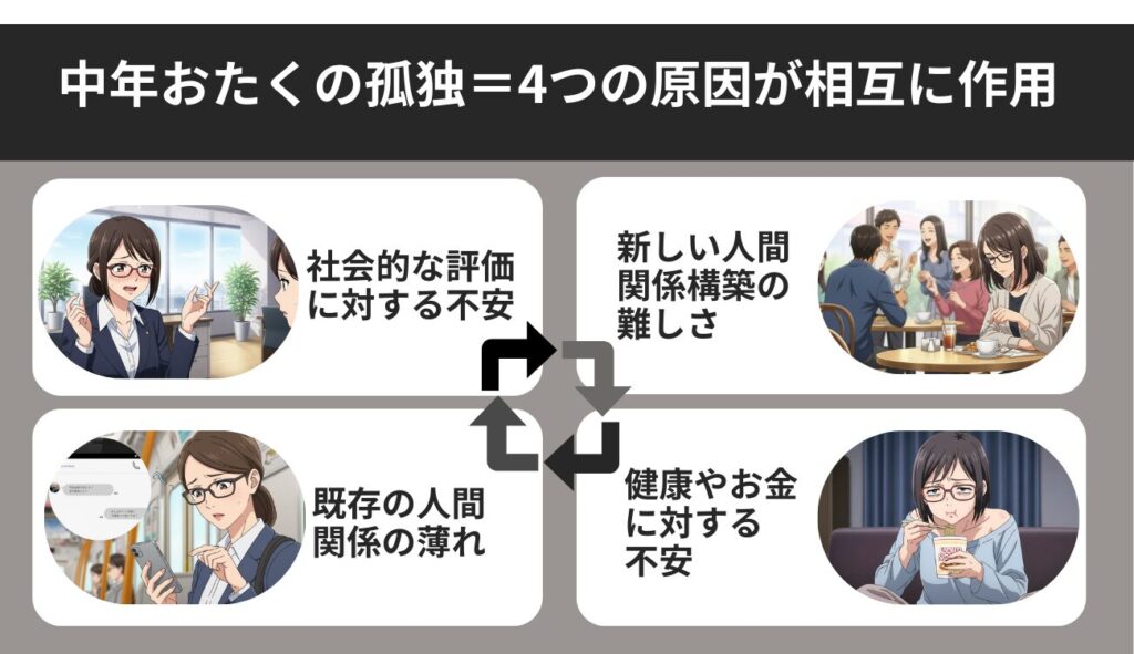 このように、中年オタクの孤独感は健康・お金・人間関係が複合的に作用することで生まれています。