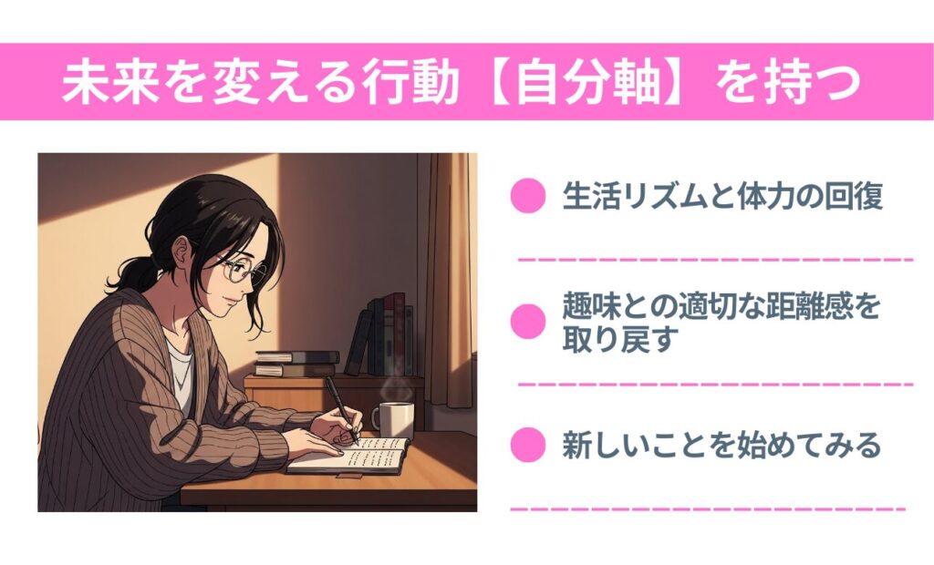 いまの状況を変えて自分軸を持って行動することで、他人の価値観に惑わされなくなります。