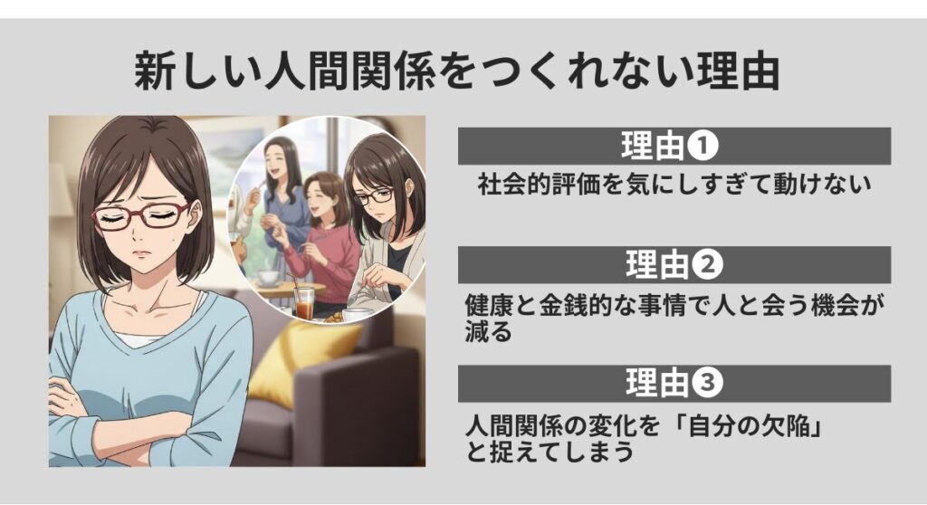 長距離移動がつらくなったり、夜遅くまでの集まりを避けるようになった結果、人と会う機会そのものが減っていきます。