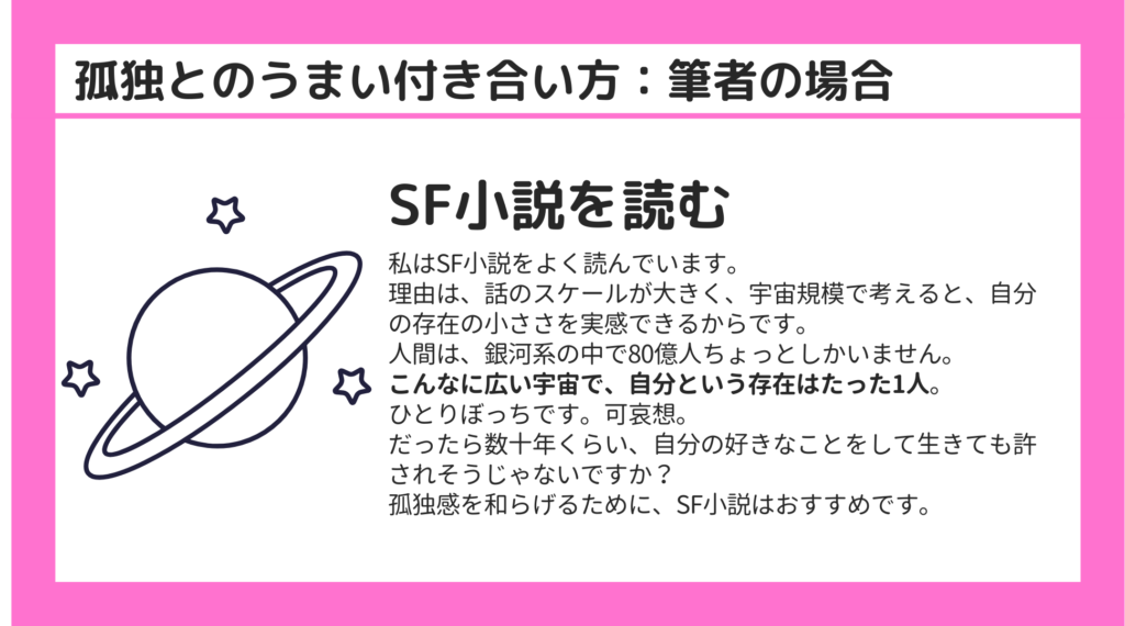 最後に、筆者が孤独と向き合うためにやっていることとして、読書について紹介します。