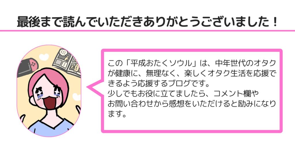 ここまで中年オタクが孤立しないための行動を紹介してきました。